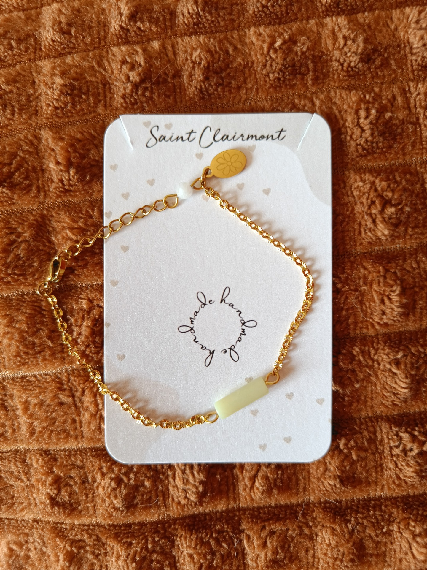 Lemon Jade, Maansteen & Bloem Armband, gemaakt van stainless steel. Het Maansteentje is facet geslepen en glinstert mooi. Het bloem bedeltje is met de hand gegraveerd in het atelier van Saint Clairmont.