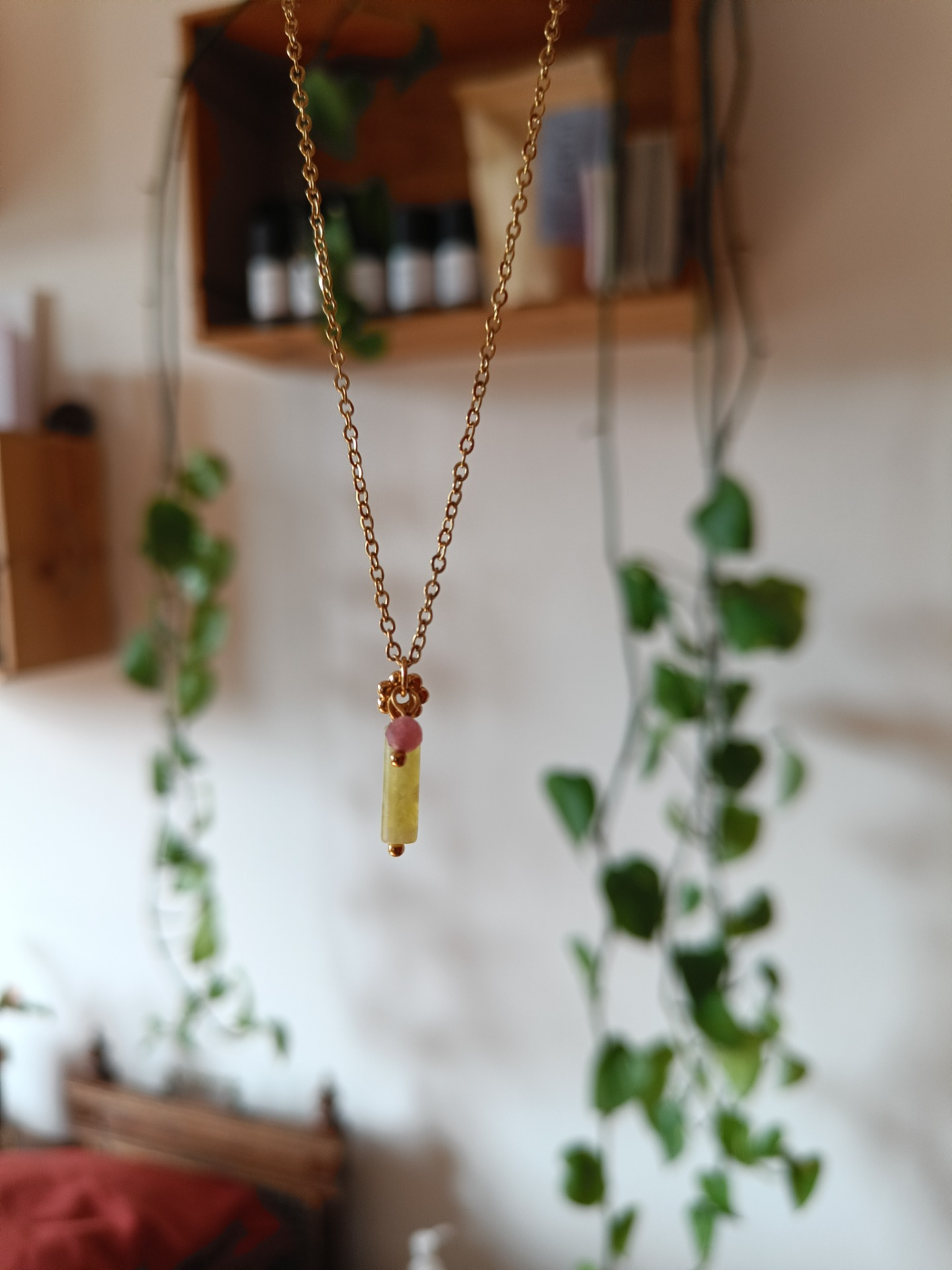 Lemon Jade & Toermalijn ketting, gemaakt van stainless steel. Het Toermalijn steentje is facet geslepen en glinstert mooi. Ook hangt er naast de edelsteentjes een klein stainless steel bloemetje.